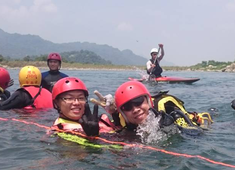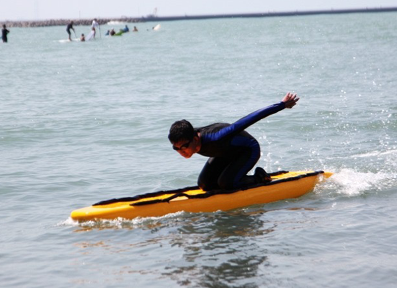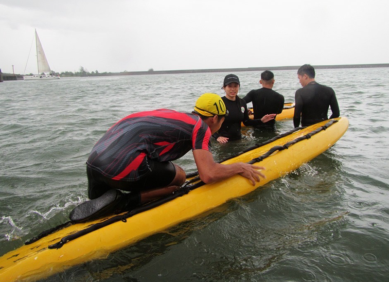 其中一名隊員游大約120公尺到指定的浮球,做信號給第二位成員後,等待第二位隊員將自己救上救生板。兩人同時划向岸邊,然後帶著救生板跨越終點線。