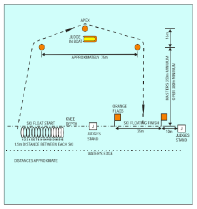 浮標: 使用三個大小等同於50公升油桶:其中兩個為「轉折浮標」,相距大約75公尺(成人賽最短300/250公尺),划行距離從低潮標記水深及膝處開始;第三個「頂點」浮標應設置轉折浮標中心處,並再向海面延伸大約16公尺,與轉折浮標形成一個弧形。