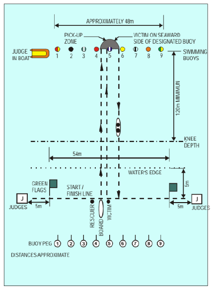 在該項目中,其中一名隊員游大約120公尺到指定的浮球,做信號給第二位成員後,等待第二位隊員將自己救上救生板。兩人同時划向岸邊,然後帶著救生板跨越終點線。